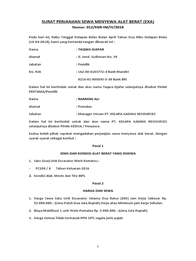 Surat Perjanjian Sewa Menyewa Alat Berat Komatsu 2016 Pdf